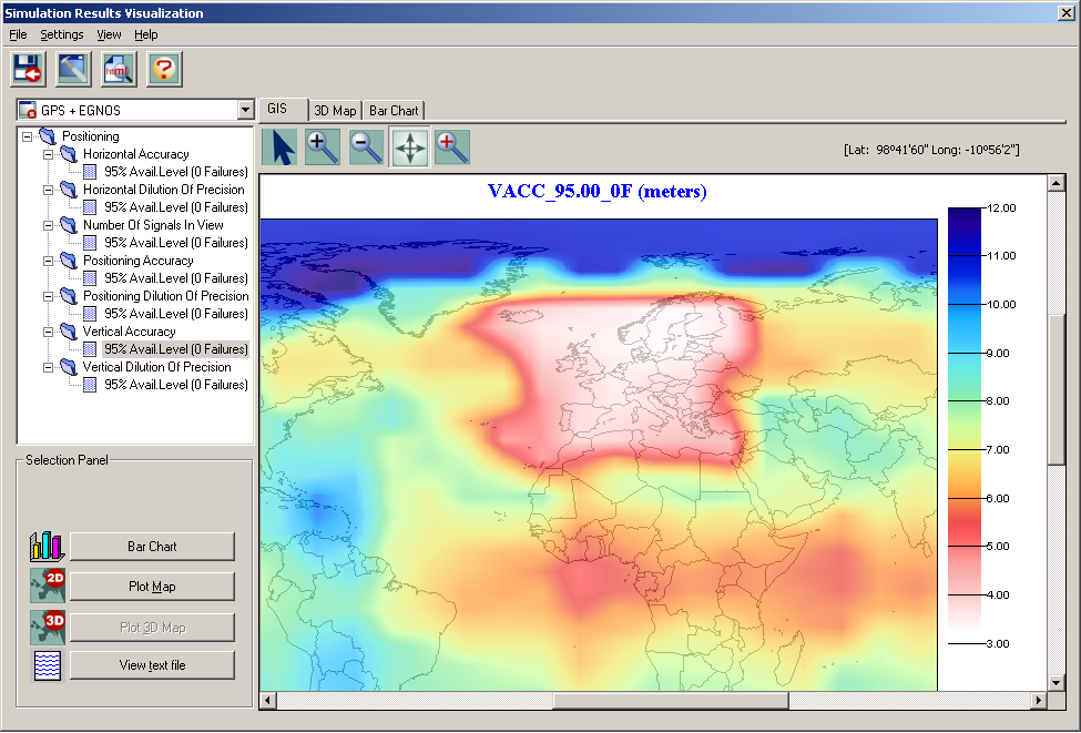 - User terminal characteristics: Which naviagation systems and services will be used. Each navigation service is characterised with its User Equivalent Range Error (UERE). User terminal may also include navigation sensors (like, for instance, odometers, accelerometers, etc) for the evaluation of dynamic users.